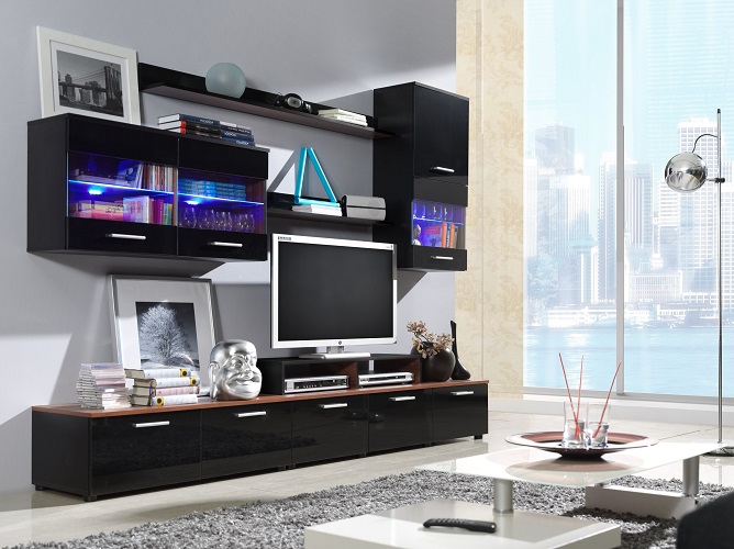 Opis i wymiar ( Wys/ Szer/ Głę.): - Szafka RTV długa: 32/150/42, trzy klapy otwierane do dołu, front w wysokim połysku. - Szafka RTV krótka: 32/100/42, dwie klapy otwierane do dołu, front w wysokim połysku. - Witryna pozioma: 51/100/29, front z wpuszczoną szybą, wewnątrz dwie półki szklane. - Witryna pionowa: 101/50/29, jeden front pełny w wysokim połysku, wewnątrz jedna półka zwykła, oraz front z wpuszczoną szybą, jedna szklana półka. - Półka krótka: 12/100/18 - max. nacisk 10 kg, panel półki w wysokim połysku. - Półka długa: 12/150/18 - max. nacisk 7 kg, panel półki w wysokim połysku. - Nadstawka RTV: 15/100/32 - max. nacisk 20 kg.